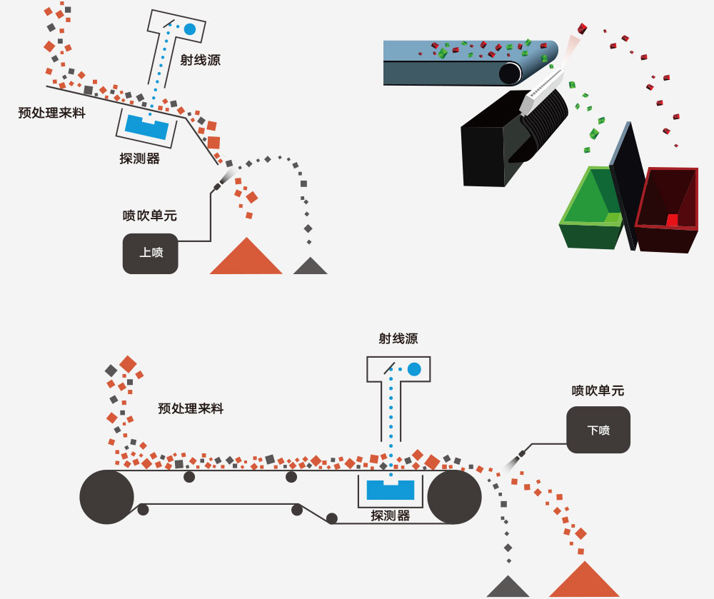 该系统基于XRT,能够有效提取被分选对象的内部物理特征,依据客户需求采用先进 AI 算法对其进行最佳分类,并配以高压气喷系统实现被分选对象的空间分离。